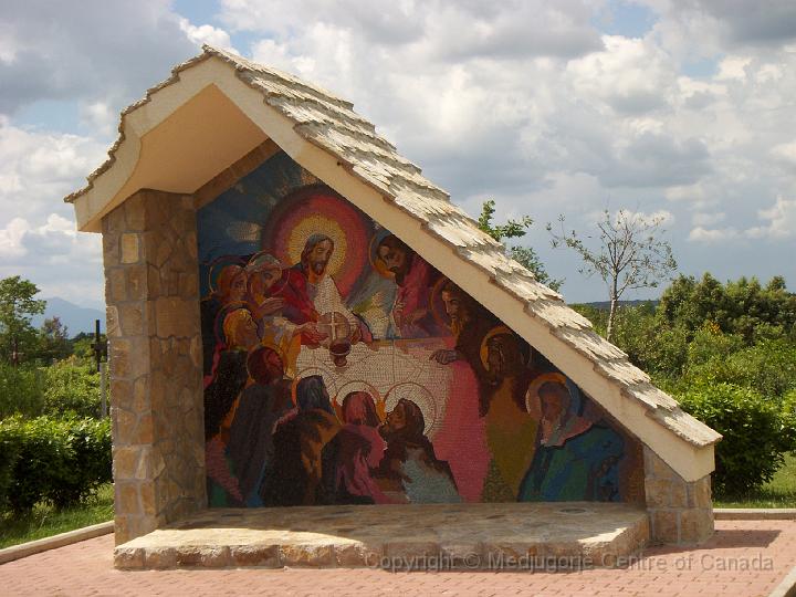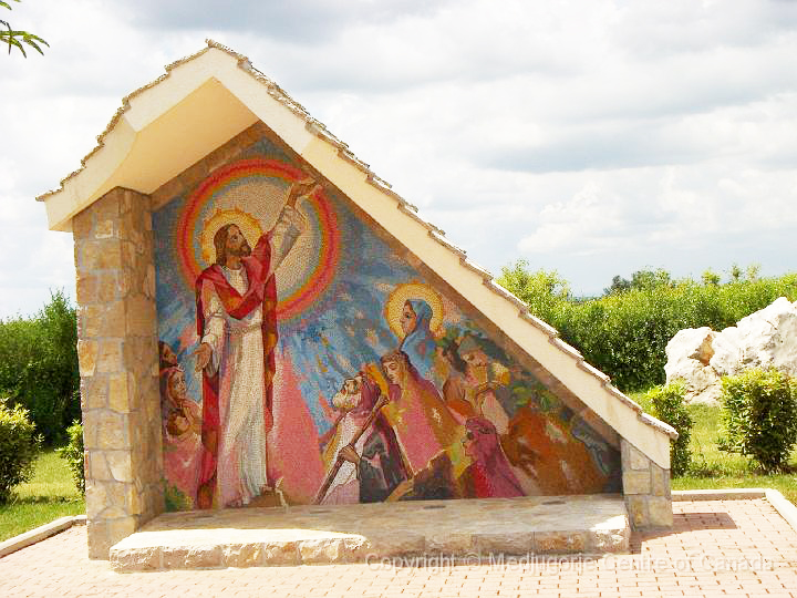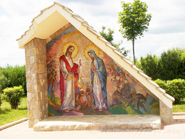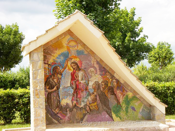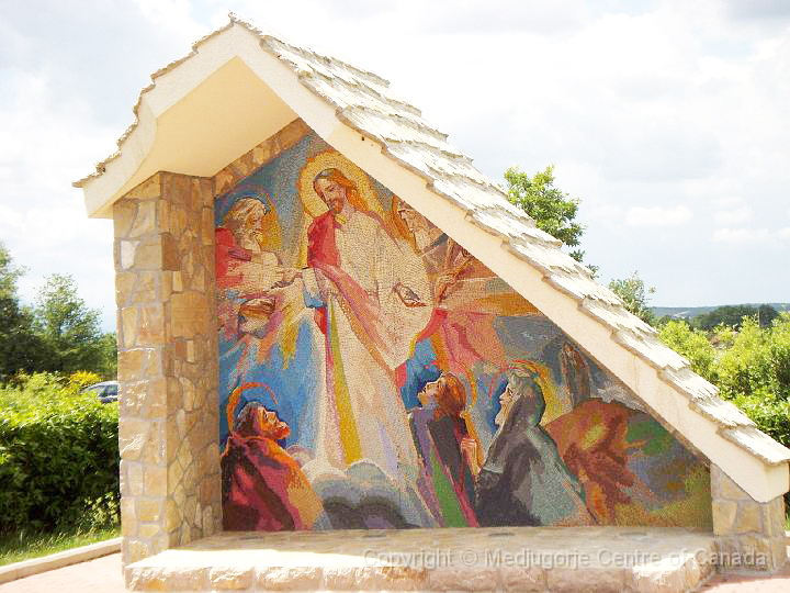 Along the interlocking stone walkway facing the Exterior Altar, on the way to the Statue of the Risen Christ, are five mosaics depicting the five Luminous Mysteries of the Rosary. Each mosaic is about seven or eight feet high, and the workmanship is exquisite. One can find many pilgrims praying in front of these mosaics, especially when the weather is nice. Silence should be maintained in this area.
